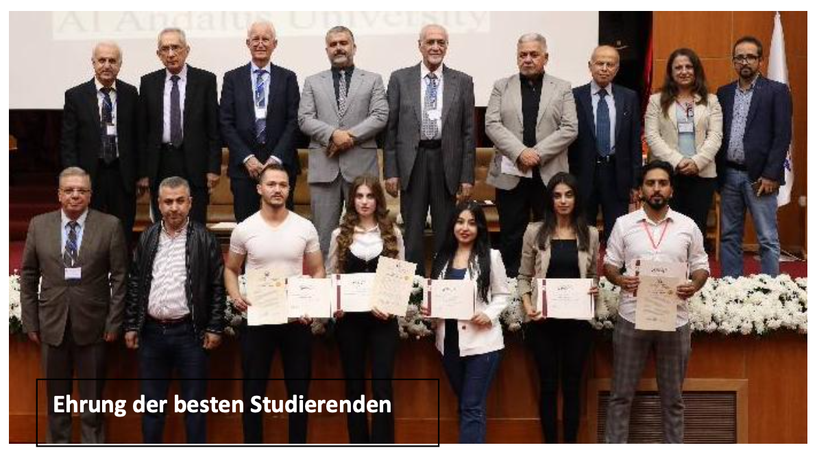die Erstplatzierten des akademischen Jahres. Den Studierenden wurden Ehren- und Anerkennungsurkunden sowohl von der Al - Andalus Universität als auch vom Verband Arabischer Ärzte in Europa überreicht – im Beisein aller Teilnehmerinnen und Teilnehmer während der Abschlusssitzung.