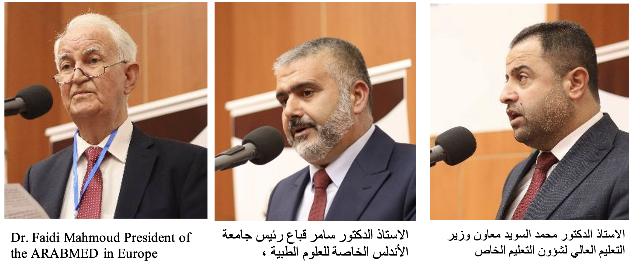 للعلوم الطبية في القدموس في سوريا،.برعاية الأستاذ الدكتور مروان الحلبي وزير التعليم العالي والبحث العلمي الذي مثله الأستاذ الدكتور محمد السويد معاون وزير التعليم العالي لشؤون التعليم الخاص، وبحضور الاستاذ الدكتور سامر قباع رئيس جامعة الأندلس الخاصة للعلوم الطبية والدكتور فيضي محمود رئيس اتحاد الأطباء العرب في أوروبا والاستاذة الدكتورة عبير قدسي معاون وزير التعليم للشؤون الإدارية و السيد سامي الزخ نائب محافظ طرطوس ممثلاً عن السيد المحافظ ورئيس جامعة طرطوس الاستاذ الدكتور أديب برهوم والدكتور أسامة الببيلي رئيس المؤتمر ممثل الاتحاد في دول الخليج ومعاون مدير الشؤون السياسية في الساحل السوري الأستاذ رأفت جيلو و نقيب صيادلة سوريا الدكتور ابراهيم الاسماعيل وممثل وزارة الطوارئ والكوارث الأستاذ عبد الكافي كيال مدير مديرية الدفاع المدني في محافظة اللاذقية و الدكتور محمد الشريف نقيب أطباء حماة ممثلاً عن نقيب أطباء سوريا وعدد من ممثلي الجهات العامة والخاصة