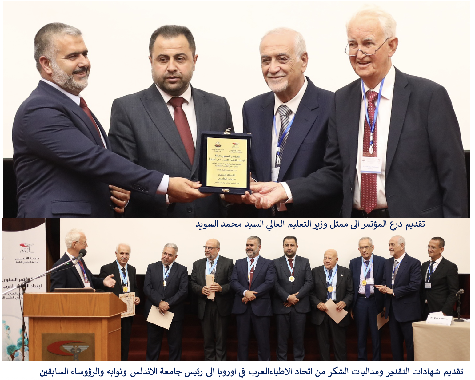 وفي ختام الجلسة تم تقديم درع المؤتمر الى ممثل وزير التعليم العالي السيد محمد السويد معاون زير التعليم العالي وقدم الشكر اليه, ومن جهته اعرب الدكتور فيضي رئيس الاتحاد عن شكره على استضافة المؤتمر في الجامعة ثم قدم شهادات التقدير ومداليات الشكر من اتحاد الاطباء العرب في اوروبا الى رئيس جامعة الاندلس ونوابه والرؤوساء السابقين و الى المشاركين في الجلسة الافتتاحية