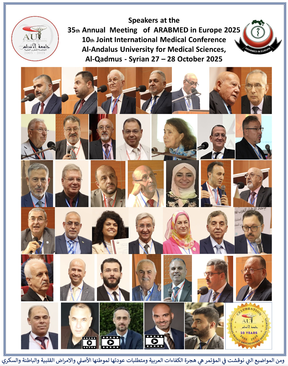 ان اتحاد الاطباء في أوروبا يقدر عالياً جهود الاطباء والزملاء في القطاع الصحي في سوريا الذين كافحوا وعملو وضحوا بانفسهم في ظل الظروف العصبة التي مرت عليها سوريا ونحن فخورون بهم ونعبرعن امتناننا وتقديرنا واحترامنا الصادق لالتزامهم الثابت في خدمة المرضى والوطن .كما نقدر بشدة جهود جامعة الأندلس للعلوم الطبية في إعداد وتنسيق هذا المؤتمر. ونحن فخورون بالتعبير عن امتناننا وتقديرنا واحترامنا الصادق لالتزامهم الثابت بالتميز. ونأمل أن يعود هذا المؤتمر بالنفع على جميع المتحدثين والمشاركين، وقبل كل شيء على مرضانا. وبصفتنا أطباءً عربًا في الخارج، يشرفنا أن نشاهد سوريا من جديد في طليعة الدول التي تهتم في تعزيز وتطوير البحث الطبي.