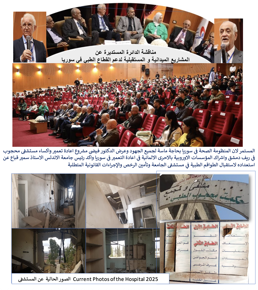 المستمر لان المنظومة الصحة في سوريا بحاجة ماسة لجميع الجهود وعرض الدكتور فيضي مشروع اعادة تعمير واكساء مستشفى محجوب في ريف دمشق واشراك المؤسسات الاوروبية بالاحرى الالمانية في اعادة التعمير في سوريا واكد رئيس جامعة الاندلس الاستاذ سمير قباع عن استعداده لاستقبال الطواقم الطبية في مستشفى الجامعة وتأمين الرخص والإجراءات القانونية المتطلبة